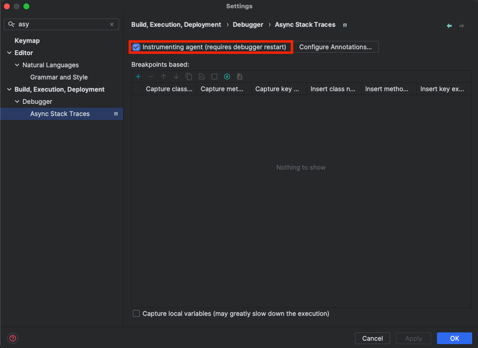 IntelliJ에서는 Settings -> Build, Execution, Development -> Debgger -> Async Stack Tarces 에서